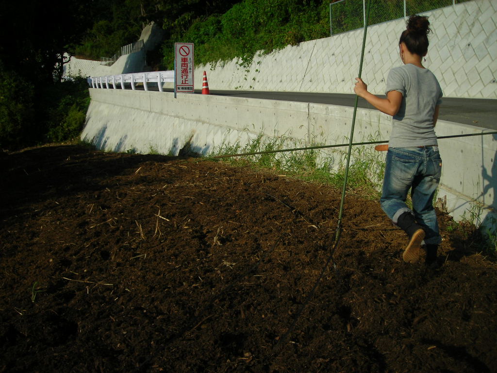 先週9/6に採りおえたトウモロコシ畑を剪定チップに変えて土を撒いていたわ。