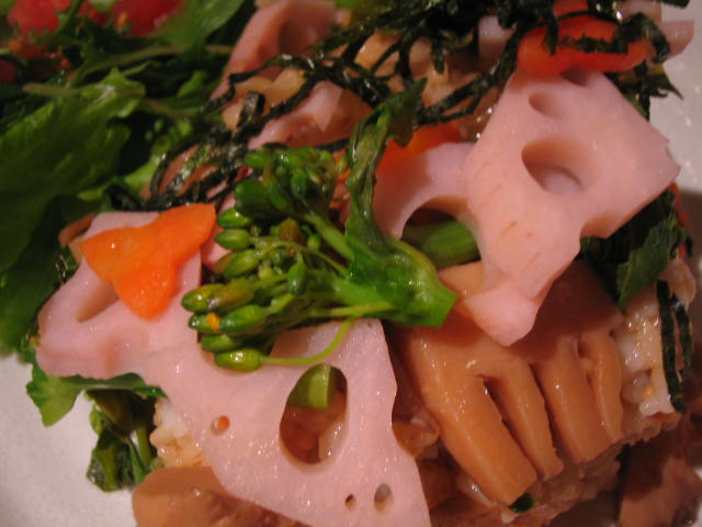 (無農薬玄米に、梅酢レンコンと大葉がいい香り!)