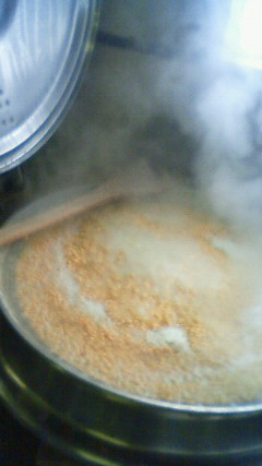 2日目、大量の大豆を茹でたり蒸したりしつつ、昨日仕込んだ米麹を一度あけてポロポロにほぐし、