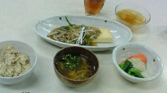 玄米ご飯、あんかけ豆腐ステーキ、茹で野菜ひまわりの種と梅ドレッシング…など実習にて